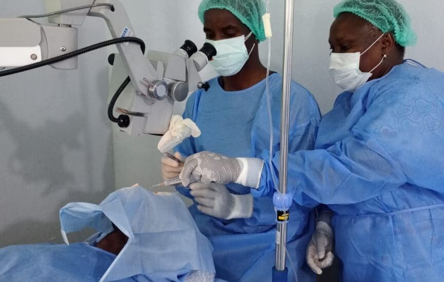 The screening camp was followed up by a surgical camp a month later, staffed by three Ophthalmic Clinical Officers (all cataract surgeons) and three surgical nurses. Of the 62 individuals diagnosed with cataracts during the screening, 38 showed up. That there were dropouts was not surprising; some people are afraid to undergo surgery. We know this from the outreach work we support at the Kwale Eye Centre, Right to Sight’s permanent partner.